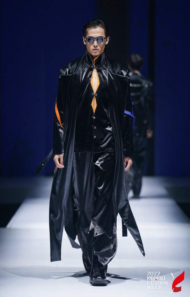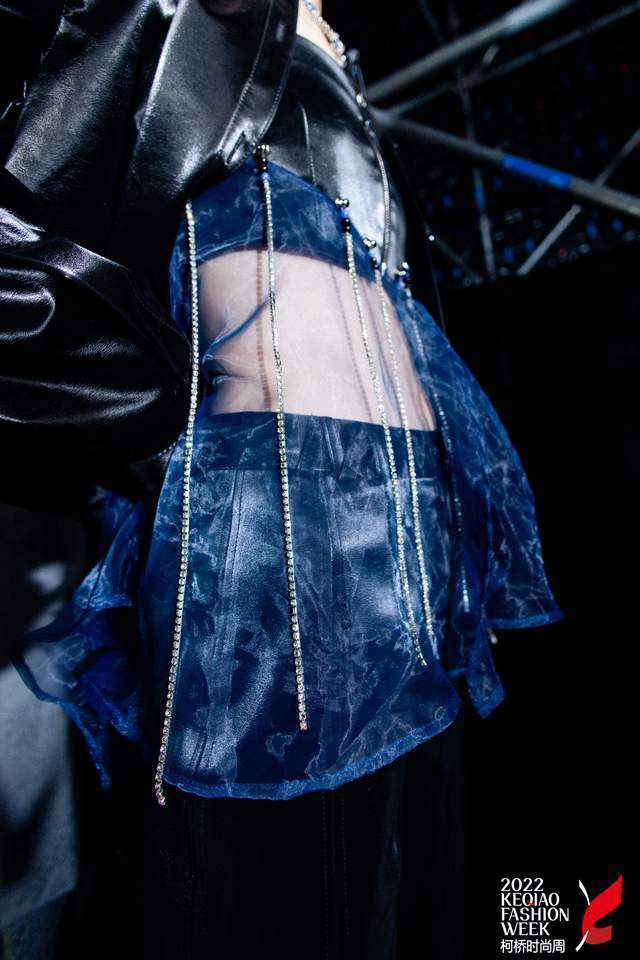 “黑”是夜的主色调——设计师的画布,蓝色与绿色的交映是破晓时分划开黑夜的色彩,是秀场的第二篇章“曙光将至”,服装与音乐相搭,色彩与节奏相应,诠释Z世代新青年的坚韧与热烈,勇面欢喜与悲伤,与自我和解。