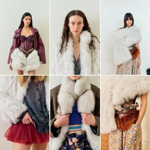 从对皮草中最平凡、基本的蓝狐的轻薄化处理以及与鸵鸟毛的灵动结合,到将皮草原有形态与产品廓形完美契合的改善设计,再到皮草帽领、皮草围巾与格纹呢大衣、丝绒外套、马海毛毛衣开衫等其他面料产品的可拆卸组合,以及回收再利用皮草零碎料制成的皮草腰带、上衣、半裙等奢华单品……王陶Taoray Wang的设计不仅是趋势,更是可持续负责任的时尚主张。