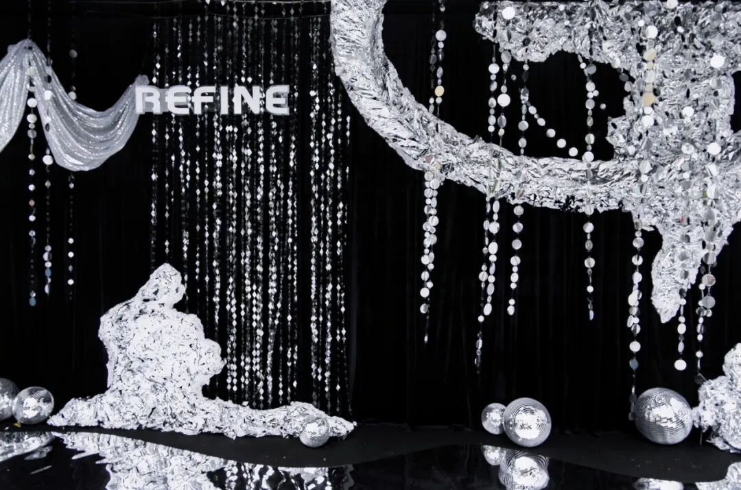 品牌创意装置更成为吸睛亮点:银黑主色调与大秀主题深度呼应,黑色背景搭配垂坠亮片串饰如星光洒落,银色花艺、镜面球与金属质感装饰错落摆放,成为品牌“视觉美学”的延伸表达。