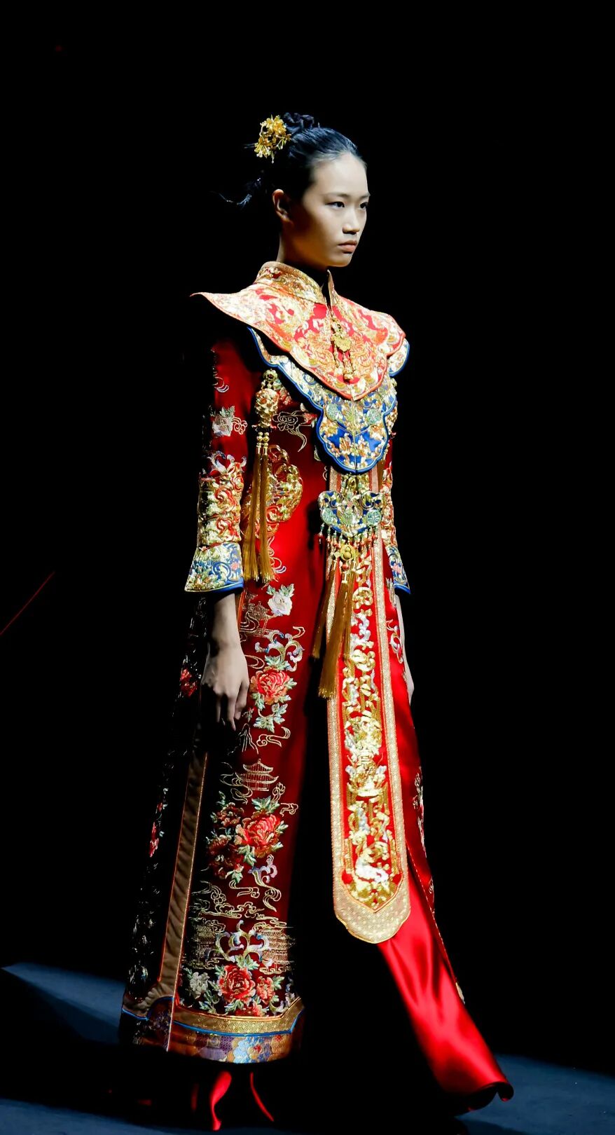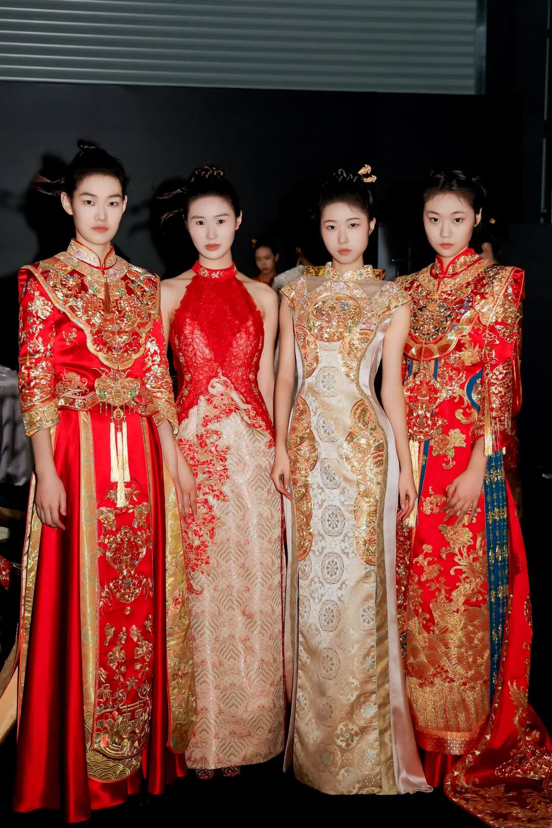 秀场上,非遗宋锦与苏绣技艺在经纬交错间编织浪漫叙事:赤玉红礼服上的盘金绣龙凤、花鸟纹样璀璨夺目,延续中式婚礼的祥瑞寓意;玉子、长春等灵力之色则勾勒出江南水乡的温婉,真丝罗缎与灵巧的打籽绣相映生辉。天玺突破传统形制,将彩帨、蔽膝等古典元素进行解构与重塑——一件红色敬酒服以收腰剪裁搭配可拆卸拖尾,既庄重亦实用,让仪式美学融入日常。