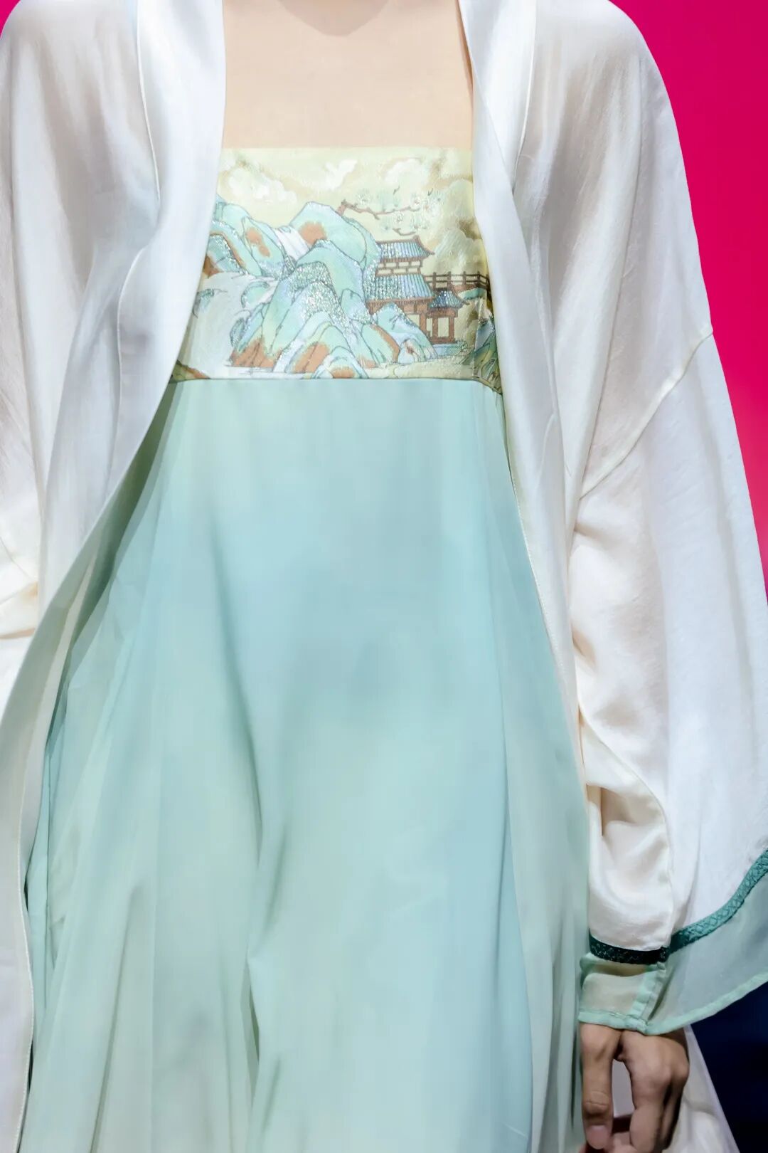计文波始终以“中华民族传统文化为创作源泉”,拒绝将传统符号简单堆砌,而是致力于用世界性的设计语言,让东方元素获得全球审美共识。此次秀场服饰以深墨绿为主色调,宛如从《千里江山图》中萃取的色彩,自带东方意境的深邃与雅致。中式立领、斜襟等经典元素被巧妙嵌入,精致的花卉刺绣并非单纯复刻古画,而是以现代针法重构,每一针线都是传统非遗与当代设计的对话。