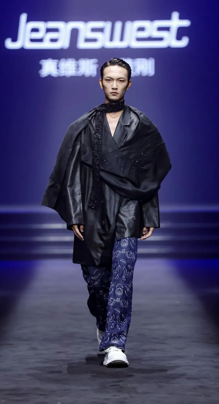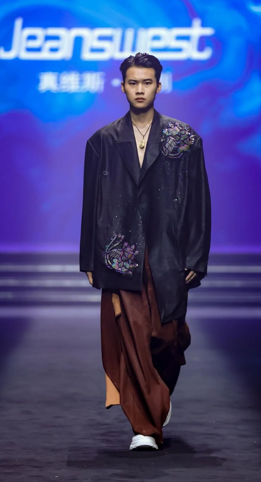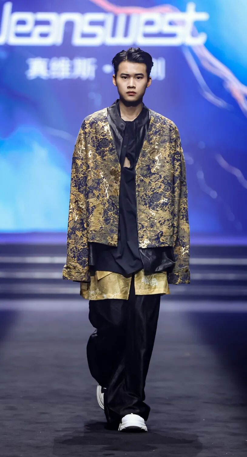 此次秀场服饰在工艺与面料上极具巧思,除了对香云纱的创新创作,更融入苗绣、苗银等非遗工艺,让服饰在现代设计中尽显民族文化的细腻与璀璨,精准契合年轻群体对“有故事、有颜值”服饰的需求。同时,面料中融入全域可降解材料PHA,践行“可持续国风”理念,并借3D打印实现科技与传统的碰撞,让非遗技艺具备产业化复制可能。设计上,黄刚以织绒填充纹样搭配珠片亮泽,让服饰兼具非遗底蕴与现代先锋感;依托真维斯“名牌大众化”理念,将非遗服饰从高价艺术品变为年轻消费者可购的日常单品。这种“非遗平民化”路径,既扩大消费群体,更赋予传统技艺传承动力——年轻人穿着让技艺有了生存土壤,科技则为其规模化赋能,这正是中国服装产业“高质量发展”的核心:守护传统、拥抱创新。黄刚认为,国风时尚周是文化自信与传统文化传播的优质载体,既为设计师提供非遗创新展示平台,也搭建了传统技艺与现代市场的对话桥梁。