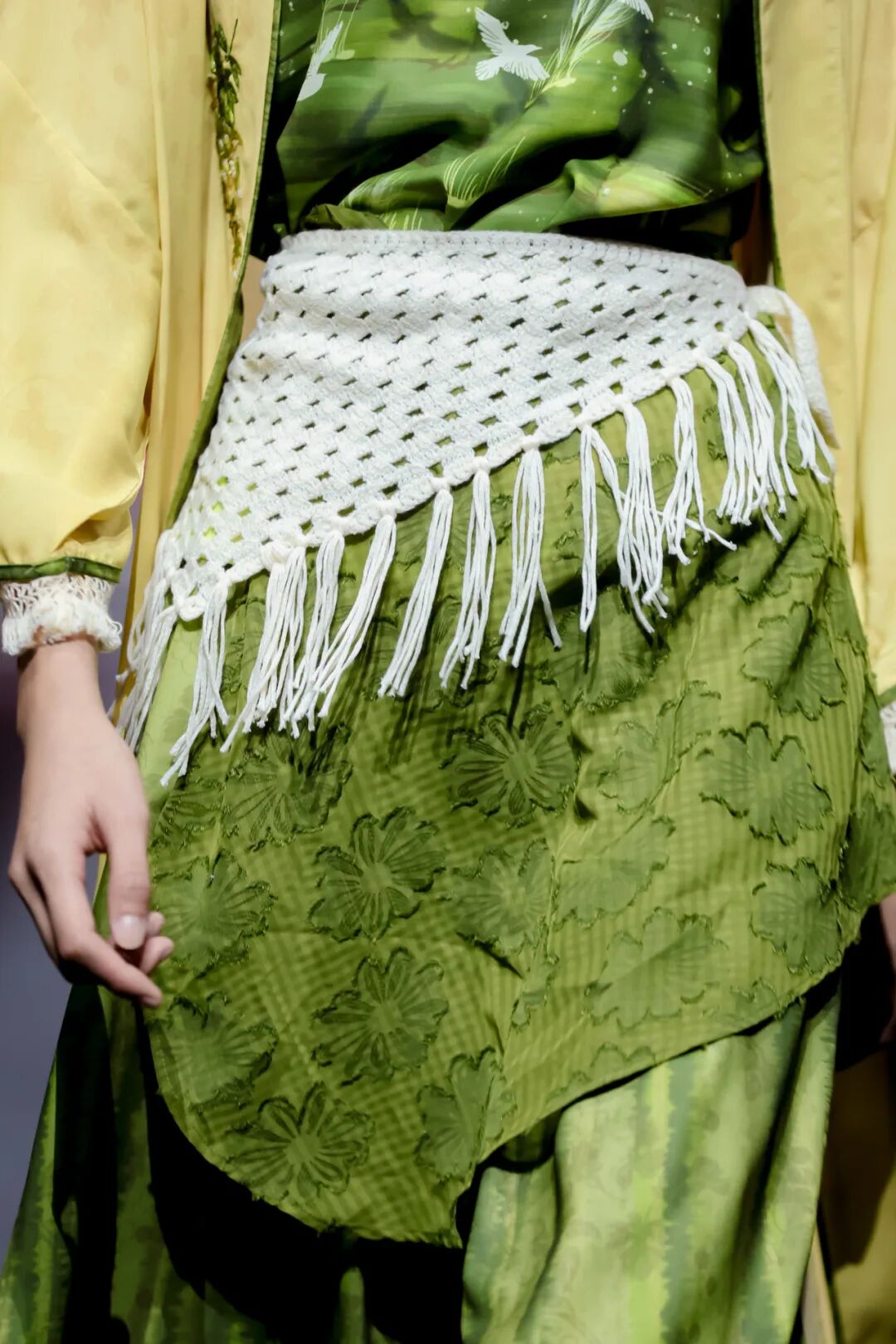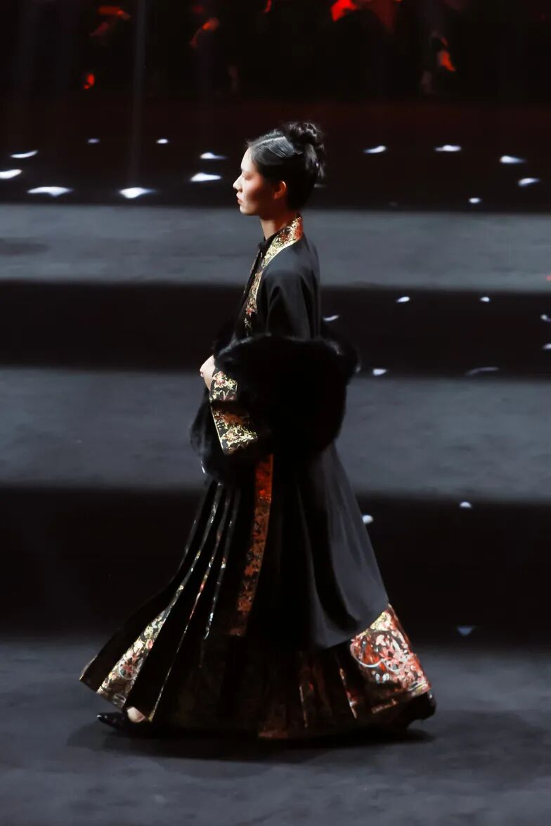 织造司作为汉服领军品牌,既为“汉服界终于有了自己的时装秀”而深感荣幸,更用一场“时空秘境”般的秀场,将这份期待化作华夏服饰从唐宋明到现代的传承与变迁。与其他品牌不同,织造司始终坚守“形制为本”的理念,却又打破“汉服只能用于拍照”的刻板印象,让传统服饰真正融入日常——秀场上,不仅将仿妆花、苏绣等传统工艺精工细作于衣间,更创新采用牛仔、小香风等现代面料,在传统形制与当代材质的碰撞中焕新汉服模样;盛唐的雍容裙裾、宋代的婉约褙子、明代的端庄袄裙依次登场,却并非简单复古,色彩上新增莫兰迪色系适配现代审美,缂丝、绒花等非遗技艺也经轻量化处理解决穿着痛点。