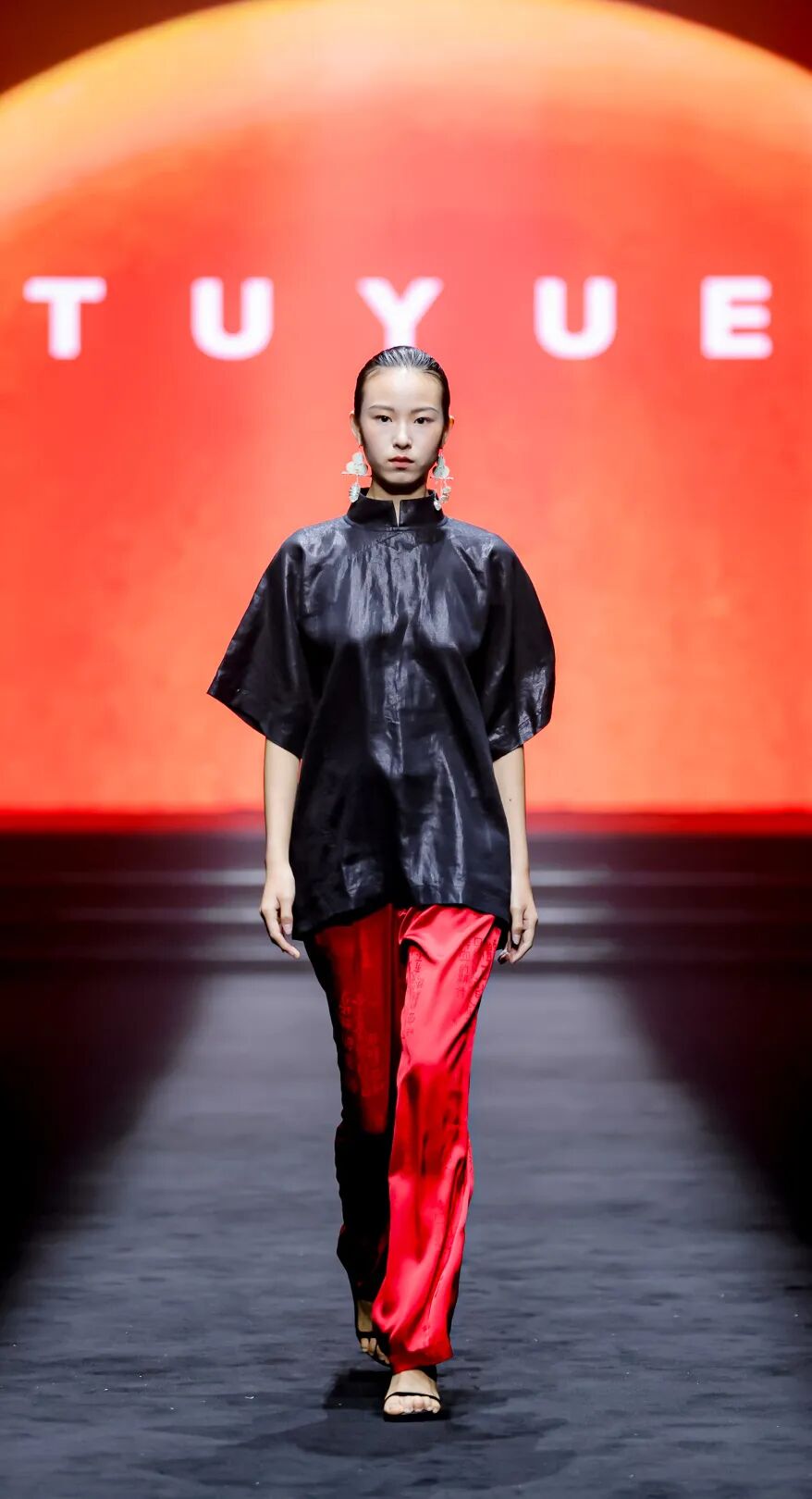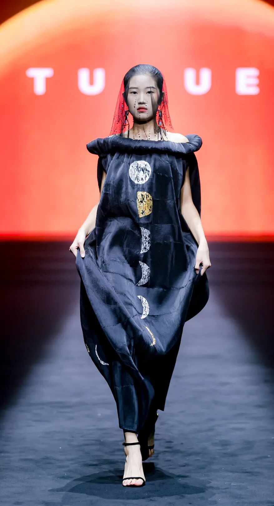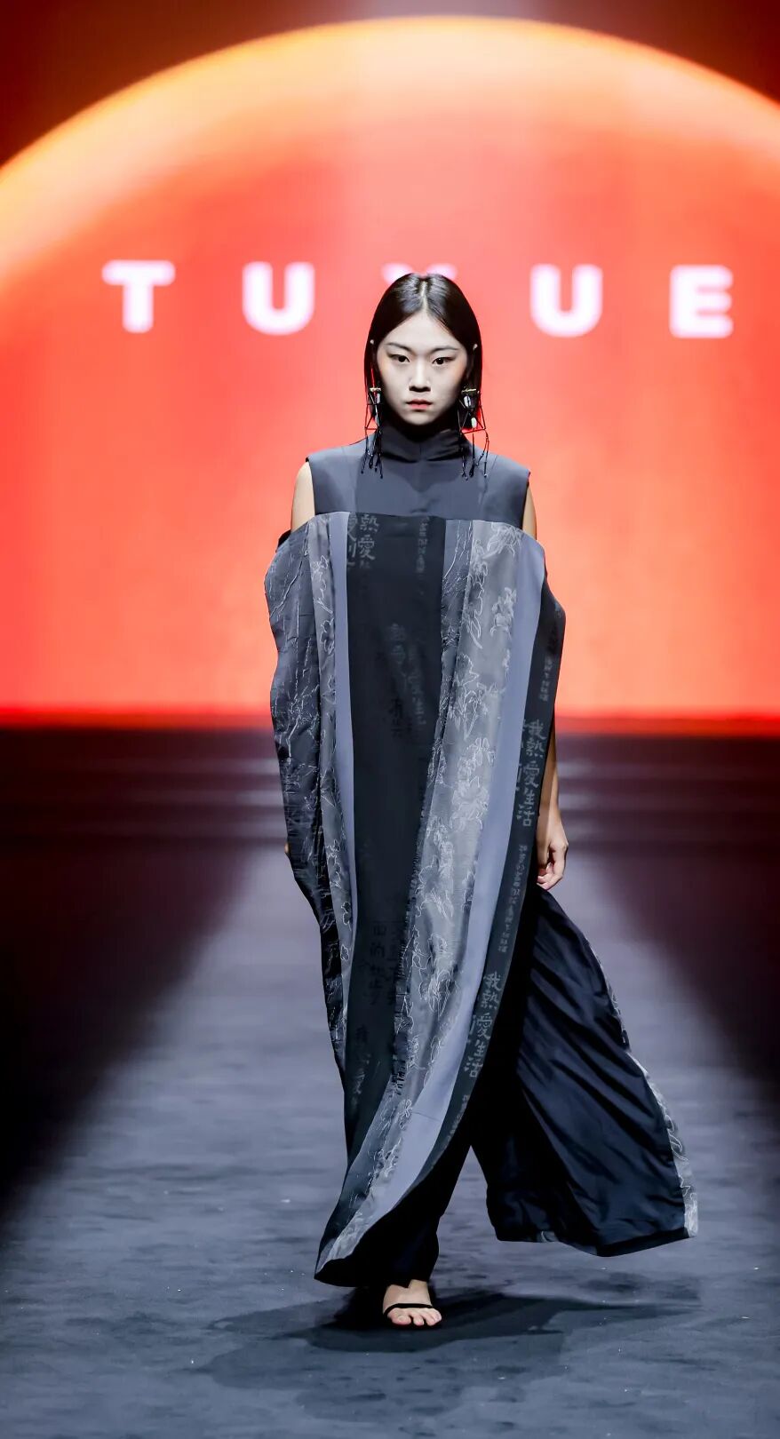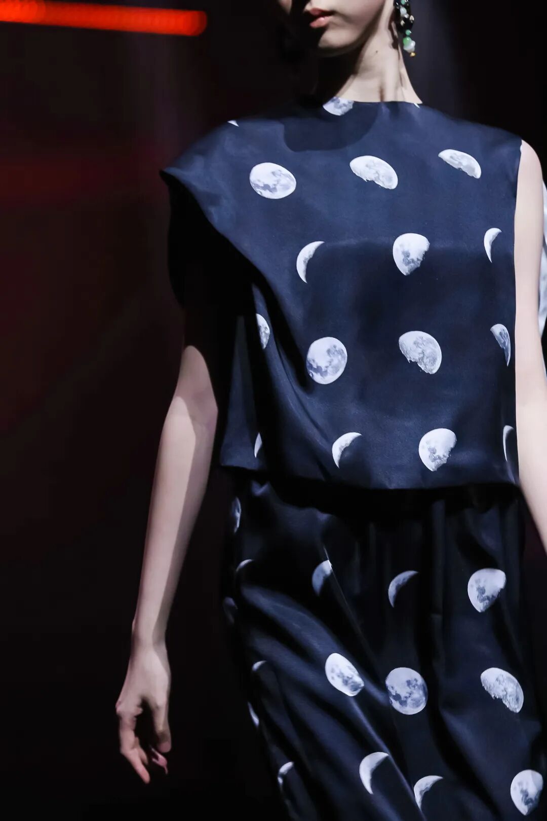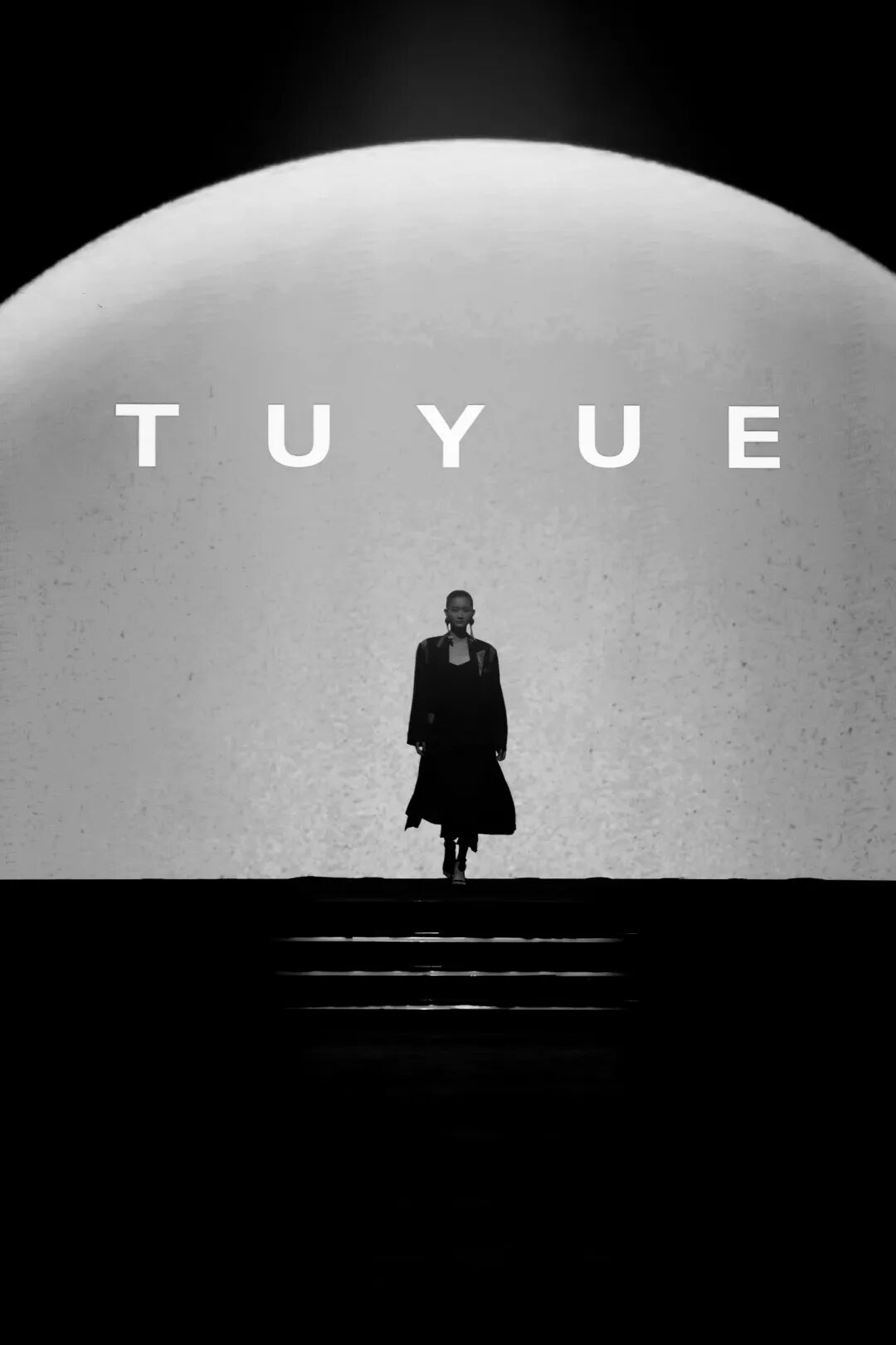 与其他品牌的浓墨重彩不同,涂月的秀场弥漫着“静谧张力”。暖光之下,模特身着黑、白、米白等素色服饰登场,线条简洁流畅,却在细节处暗藏巧思:月相图案的配饰、螺旋纹的刺绣,都是从东方传统意象中汲取灵感,却以极简的形式呈现,没有繁复的花纹,却通过面料的垂坠感、剪裁的利落感,传递出“留白即意境”的东方美学。
